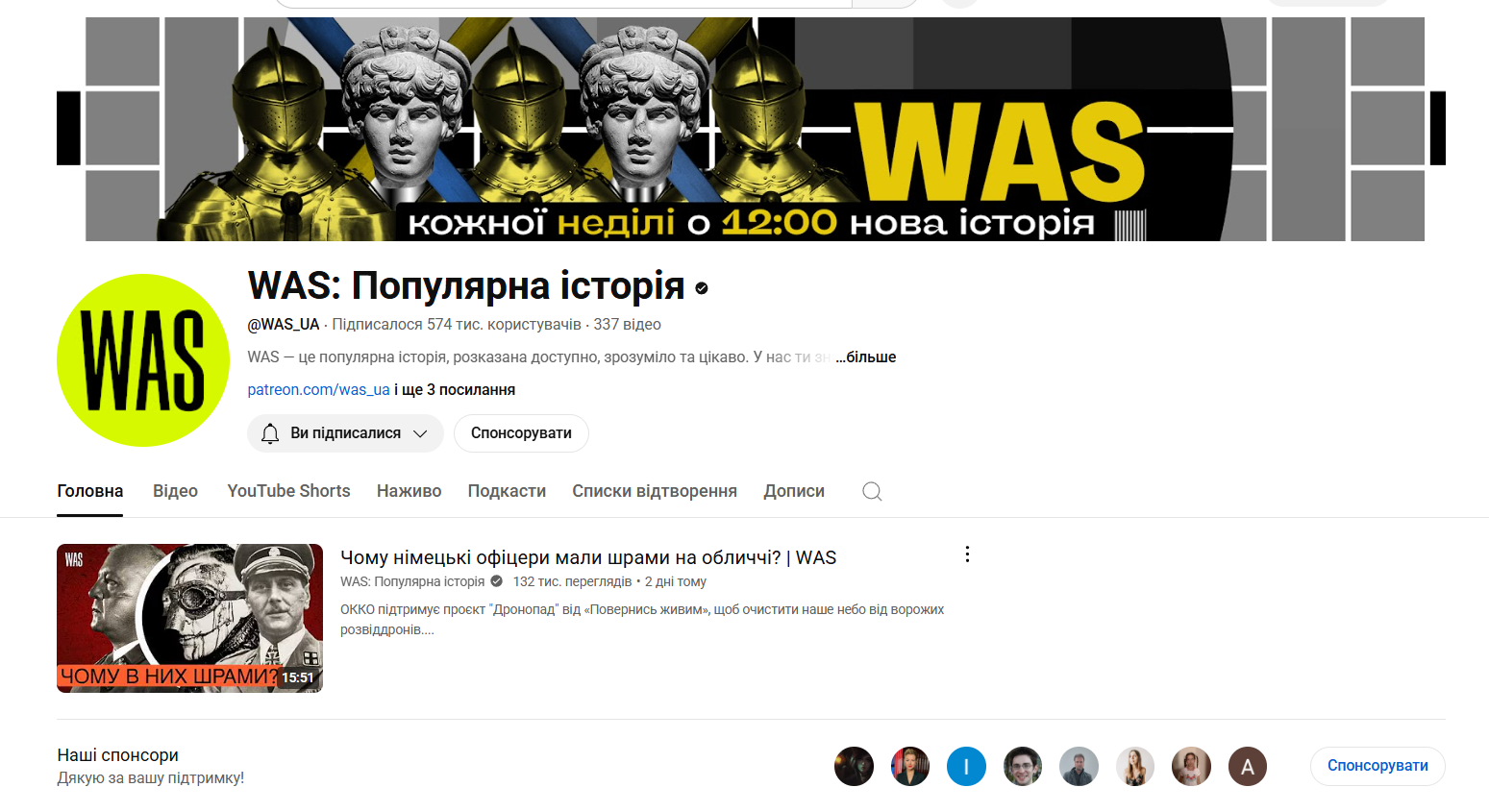 WAS існує завдяки Patreon. Спонсорів згадують у кожному відео — публічно і з вдячністю. Це дозволяє тримати якість на висоті, не залежати від політичних чи комерційних замовлень і робити історію цікавою для всіх.