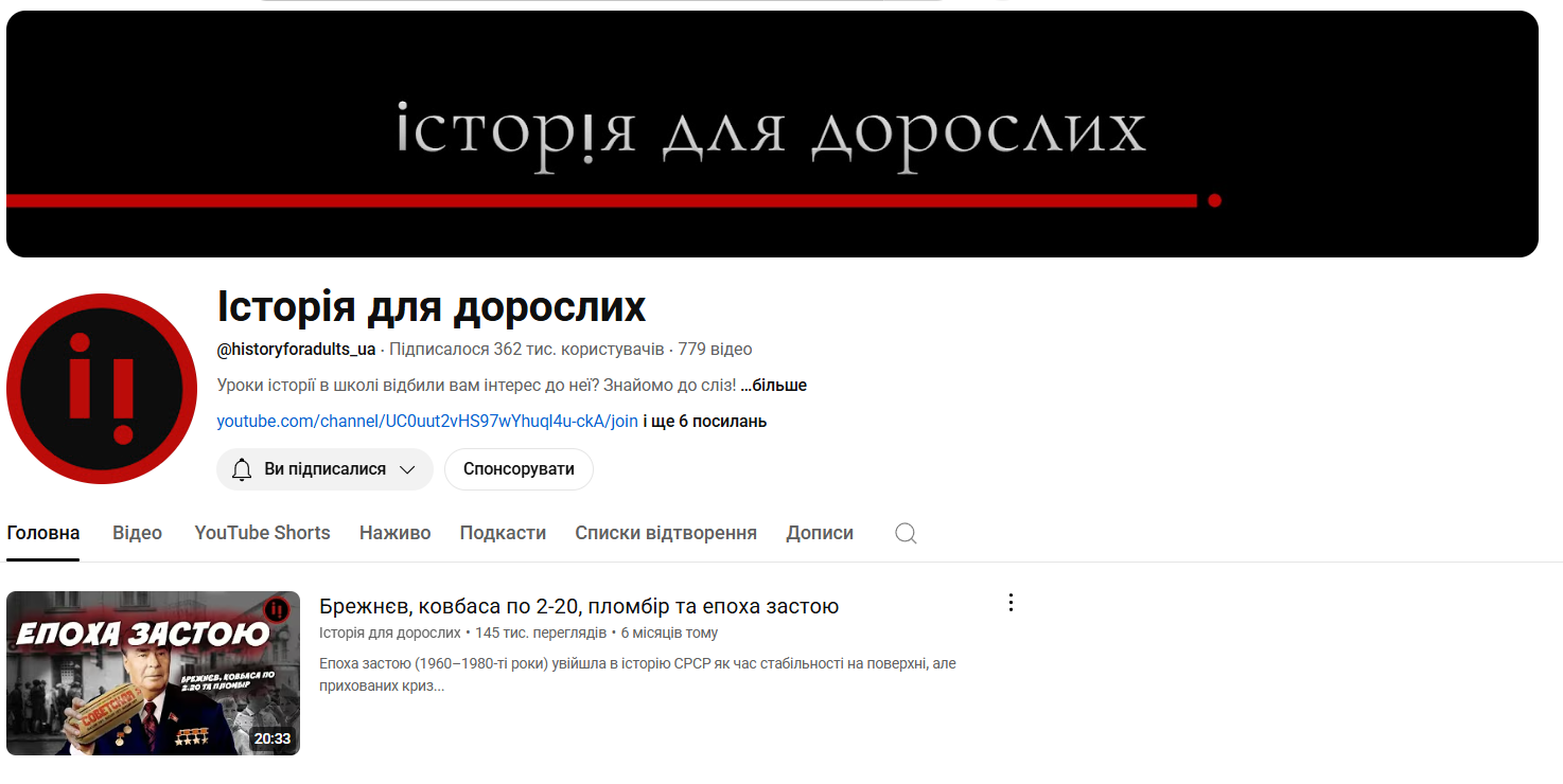 Канал одразу вирізнився стилем: тут немає нудного моралізаторства, але й немає легковажності. Глядачів приваблює те, що історія подається живо — з іронією, без пафосу, але й без вигадок. Це історія без міфів, але з людським обличчям. Тут можна посміятись, не спотворюючи правду, і здивуватись, не піддаючись маніпуляціям. Саме тому канал уже має понад 300 тисяч підписників — і ця цифра постійно зростає.